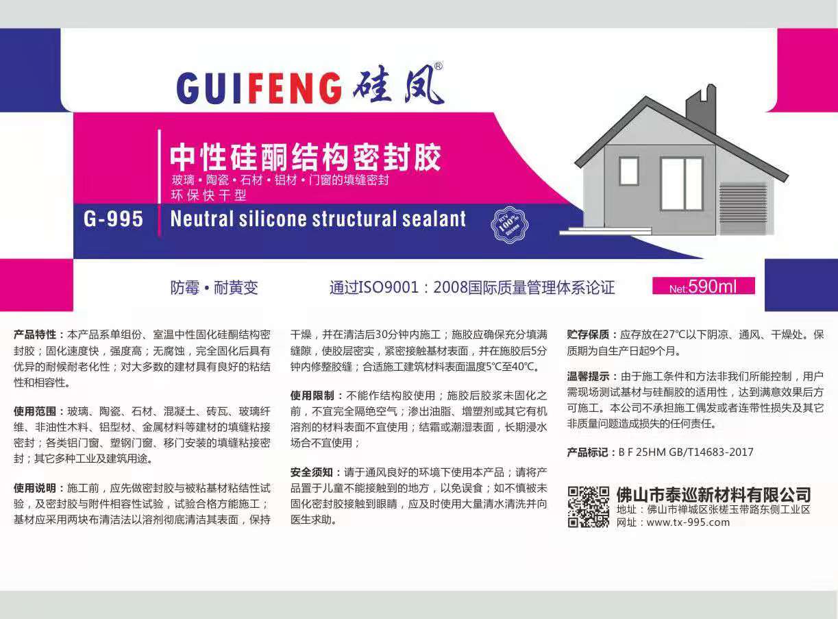 产品特性:本产品系单组份、室温中性固化硅酮结构密封胶;固化速度快,强度高;无腐蚀,完全固化后具有优异的耐候耐老化性;对大多数建材具有良好的粘结性和相容性。